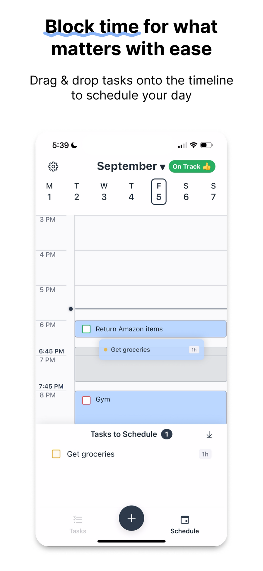 • Calendar & Time-blocking – Interactive calendar and timeline views with drag-and-drop scheduling.